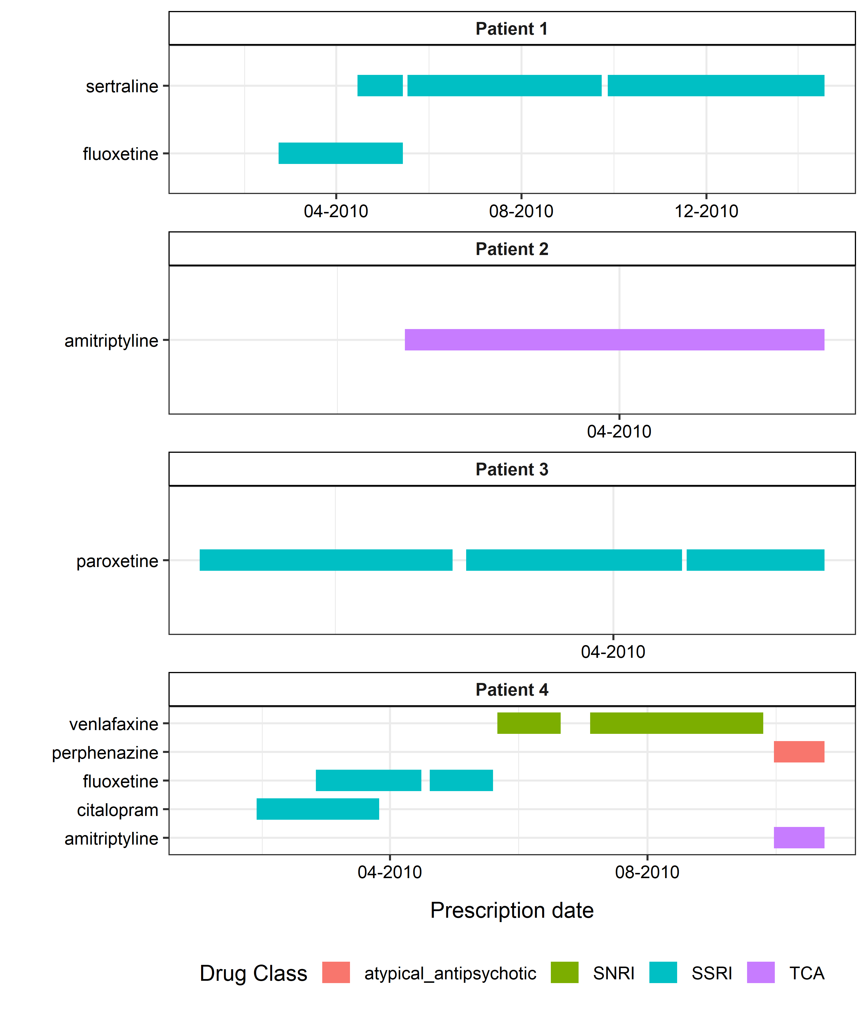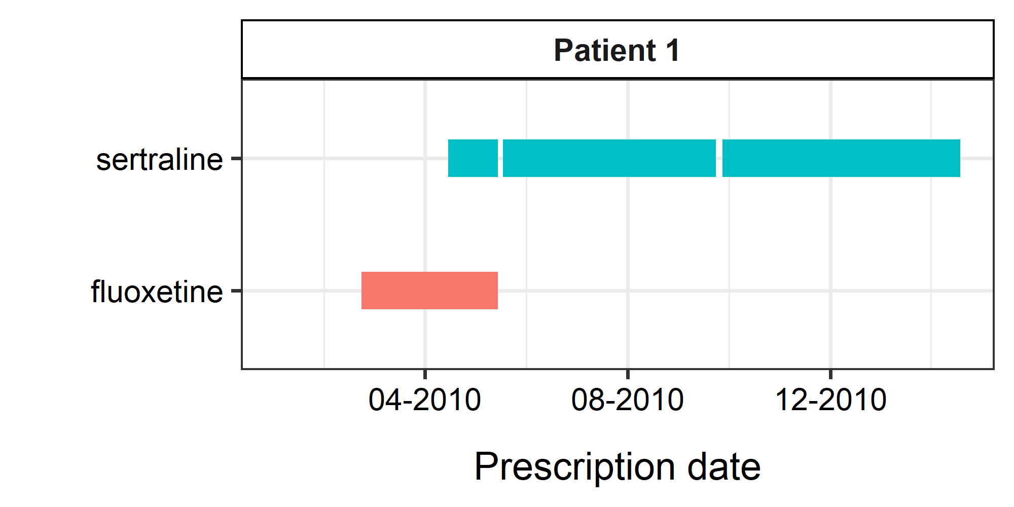 argument).A sample figure the fluoxetine prescriptions shown below (Panel A/B), with the segments represent the expected exposure periods for each prescription (assuming each prescription lasts for 28 days).