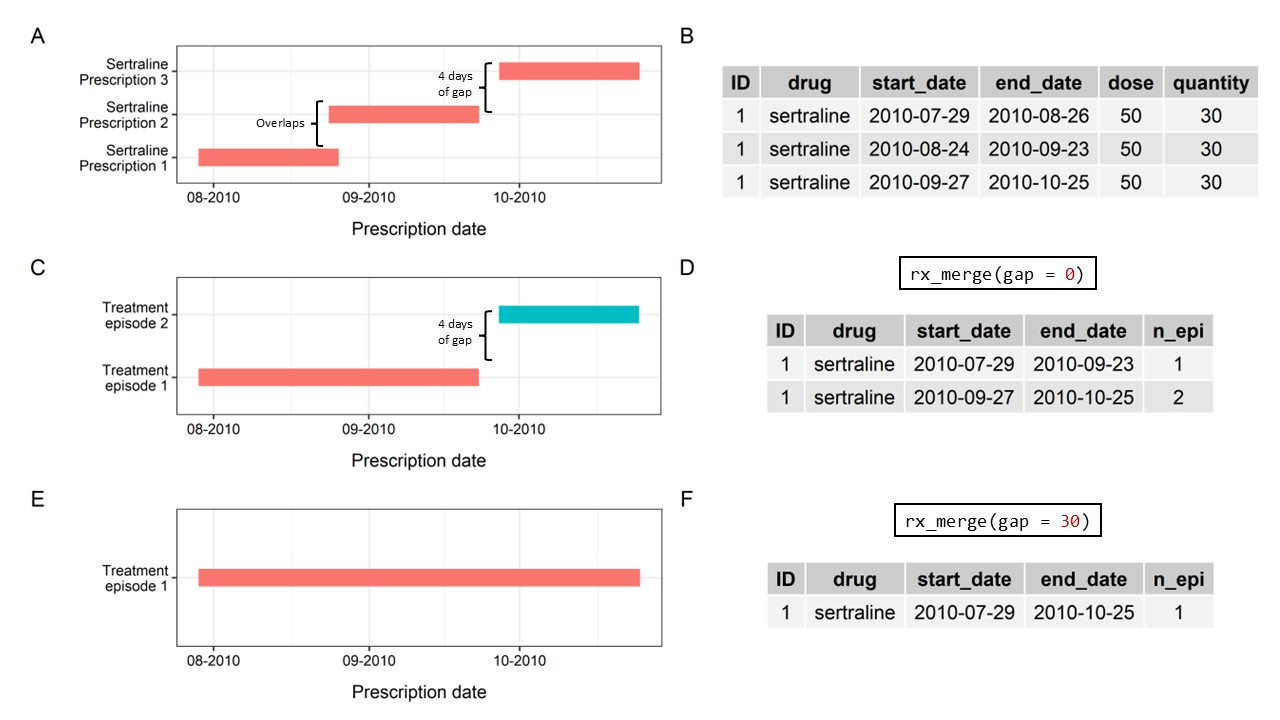 With a 7-day gap, prescriptions that were less than 7 days apart would be merged together into the same treatment episode (Panel E/F).
